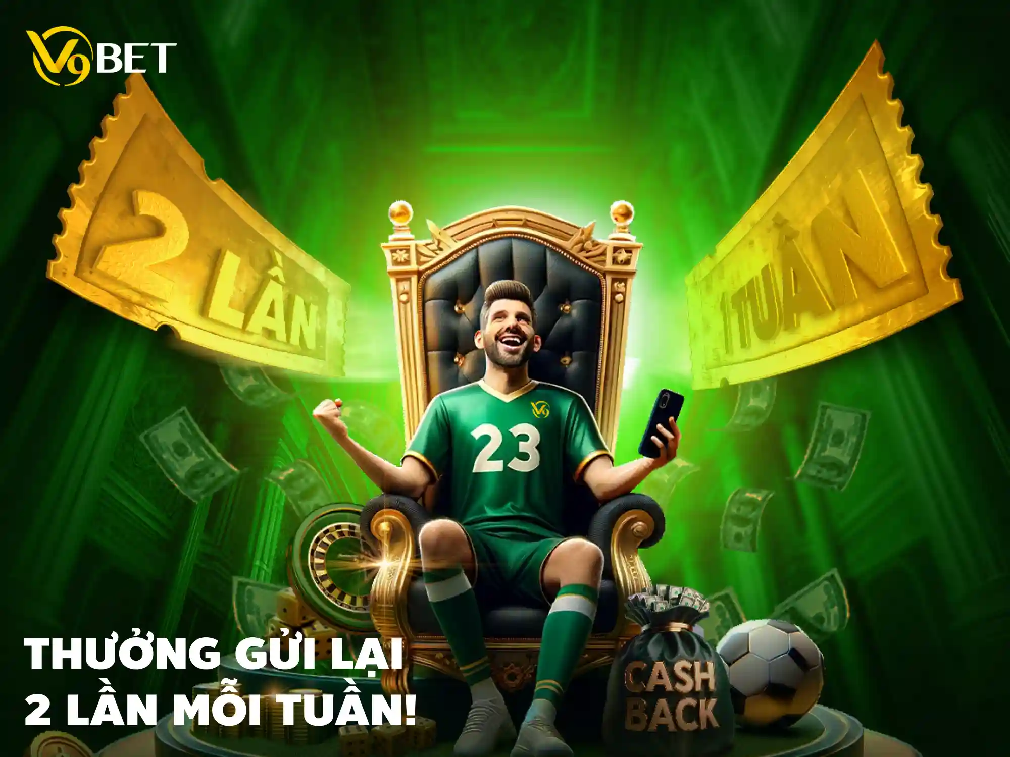 Chương trình thưởng gửi trở lại 2 lần một tuần của V9Bet áp dụng cho các khách hàng thực hiện gửi tiền lại. Mỗi tuần được chia thành hai giai đoạn, và khách hàng có thể nhận thưởng lên đến 20% trên tổng số tiền gửi lại trong mỗi giai đoạn.